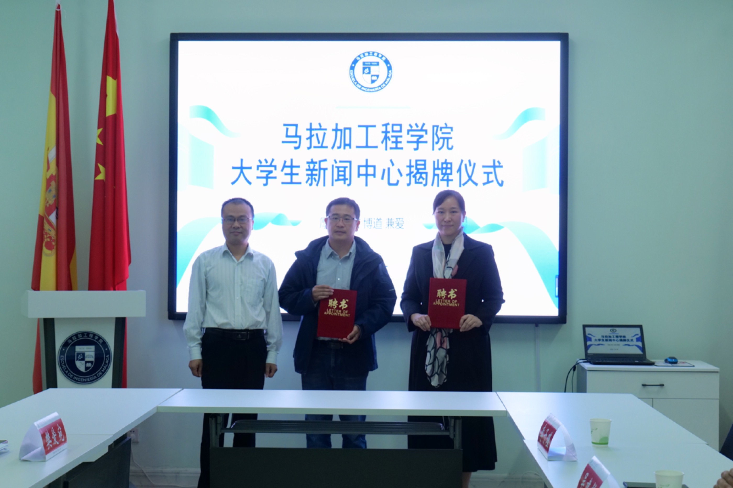 吴建彪、付岩岩为太阳成tyc122cc集团老员工新闻中心揭牌。在热烈的掌声中,樊爱宛为新闻中心特聘教师王卓菲和李子瑾分别颁发聘任证书。