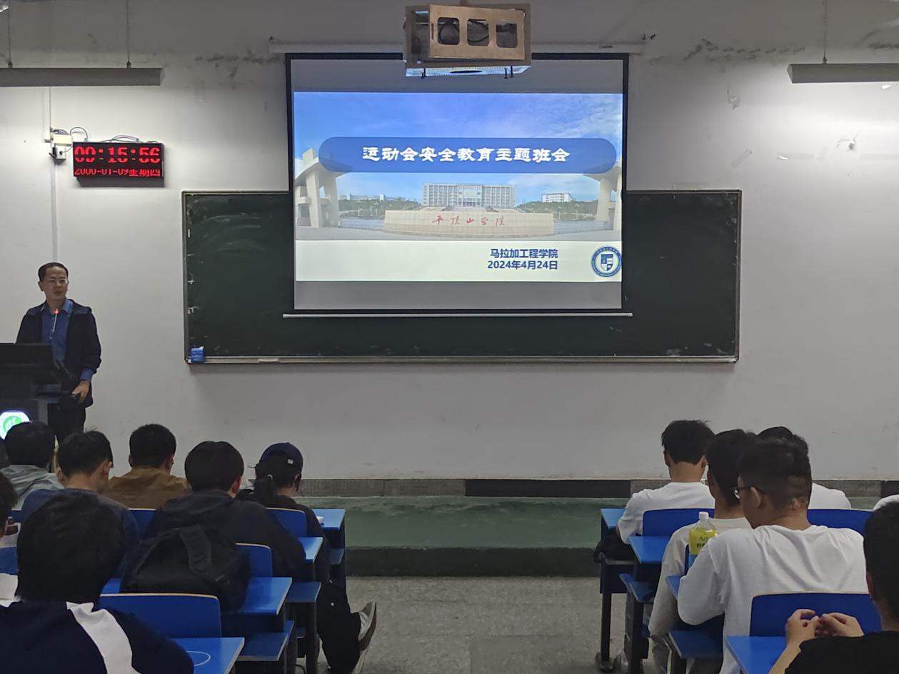 4月24日,太阳成tyc122cc集团在4406教室开展运动会安全教育主题班会。太阳成tyc122cc集团团委副书记赵培杰、2023级辅导员宋李敏及2023级全体员工参加此次班会。班会由赵培杰主讲。