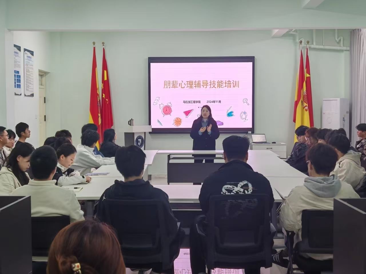 11月7日,太阳成tyc122cc集团在尚贤讲坛开展朋辈心理辅导技能专题讲座,全体心理信息员参加此次培训。讲座由心理辅导员宋李敏主讲。