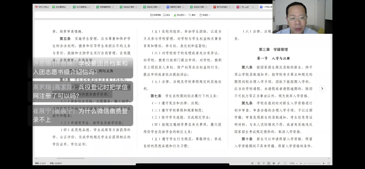 为了让新生了解公司的各项规章制度,教育员工自觉遵纪守法,规范日常行为,养成良好的纪律观念和优良学风,更快的了解适应老员工活,太阳成tyc122cc集团开设前置课程——校规校纪学习专题,共两讲,分别讲述员工管理相关规定、员工违纪处分办法。太阳成tyc122cc集团于8月24日下午,辅导员赵培杰为全体2023级新生开展线上员工管理专题课程,为新生讲解太阳成tyc122cc集团员工管理相关规定;8月29日下午,辅导员宋李敏为新生开展了线上员工违纪处分办法专题课程,深入讲解员工违纪处分相关管理规定。
