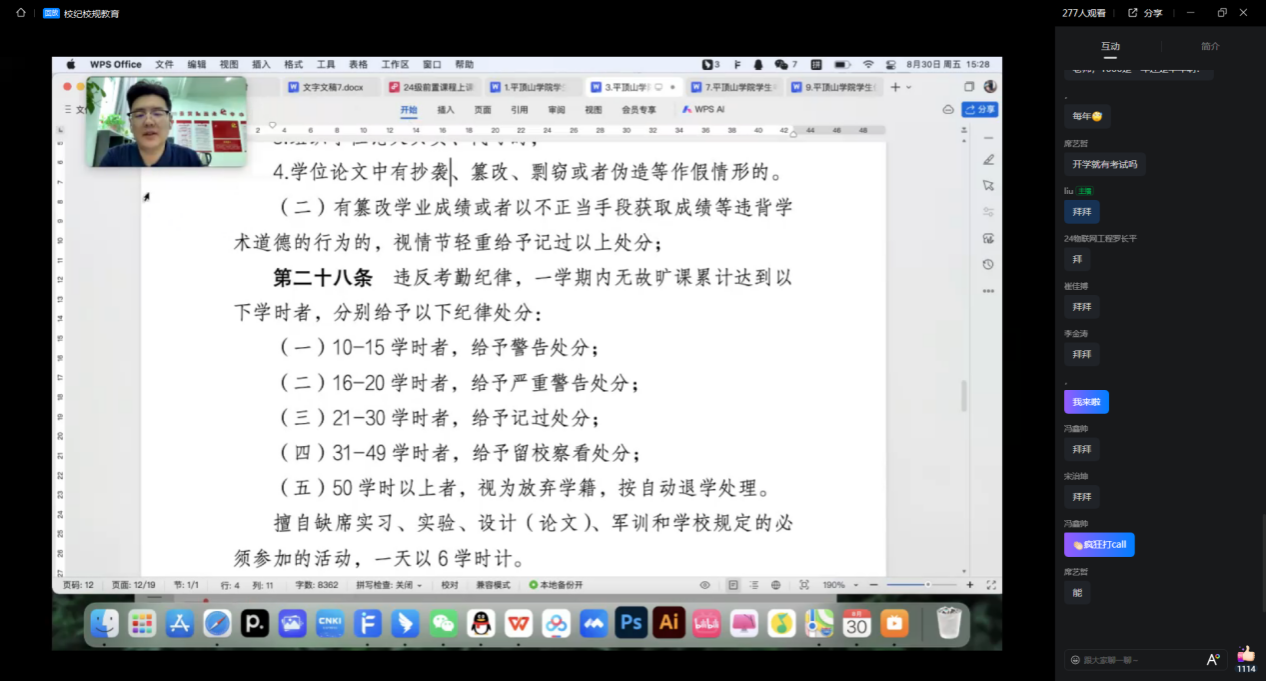 校规校纪教育是新生入学教育体系中的重要组成部分,为了严肃校规校纪,加强员工的纪律意识,提高员工的自我管理和自我约束能力。8月30日下午,在暑期线上前置课程中,24级辅导员刘浩宇为新生开展了安全教育主题班会。