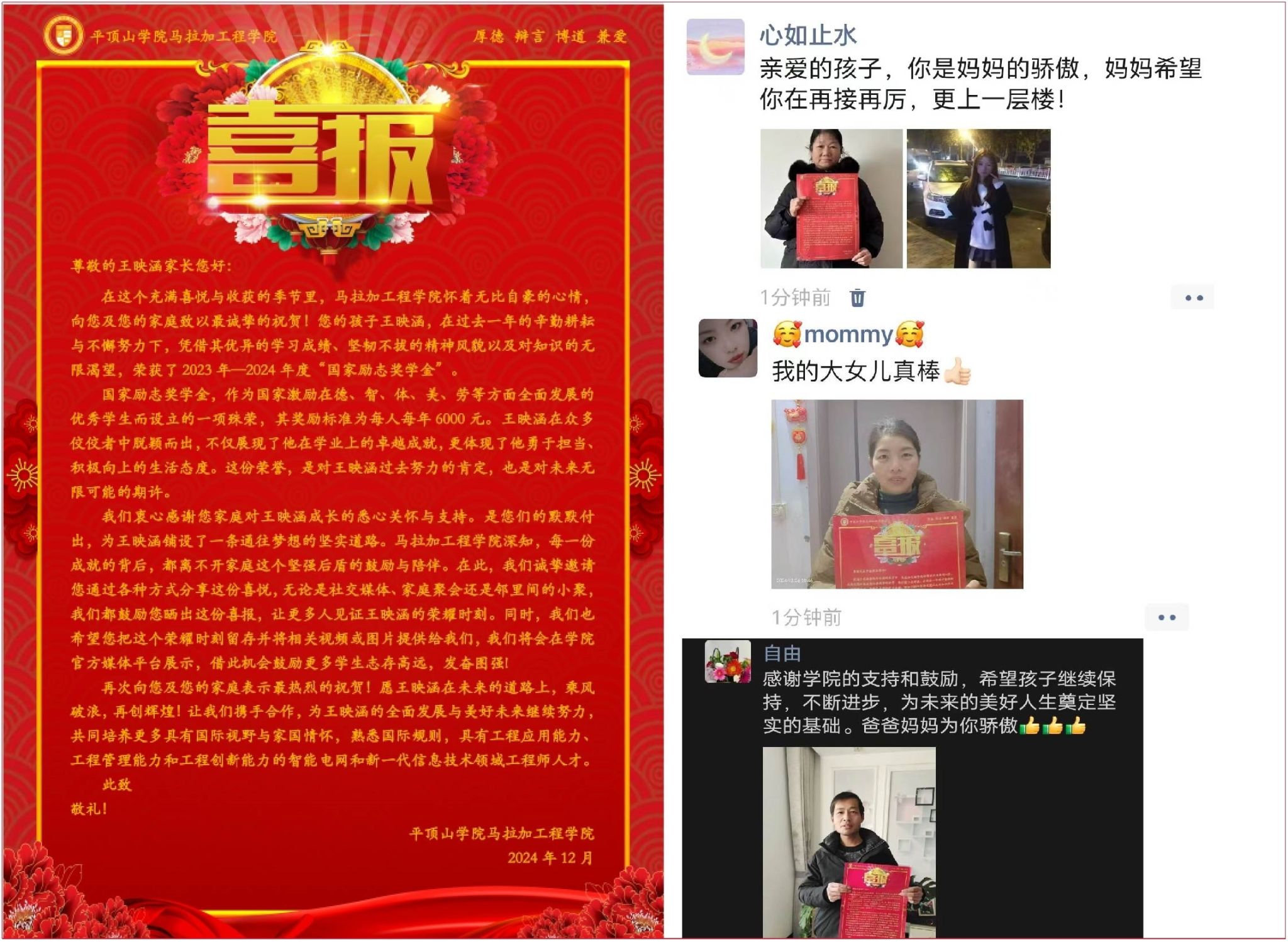 2024年12月26日,太阳成tyc122cc集团为荣获2023—2024年度国家励志奖学金的14名员工家长邮寄喜报,让他们共同见证员工在校期间的成长与荣耀,使这份荣誉与家庭的温暖紧密相连。